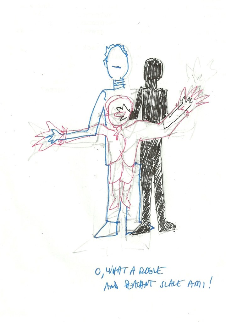 Schematic sketches of the Puppeteer, aided by the unexplained Assistant Puppeteer, whose whose left hand emerges in place of the Puppeteer’s through the Puppeteer’s shirt cuff.